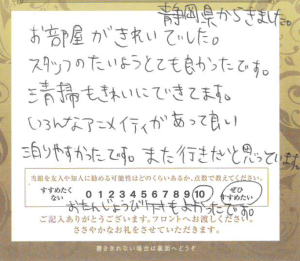 静岡県からきました。お部屋がきれいでした。スタッフのたいようとても良...