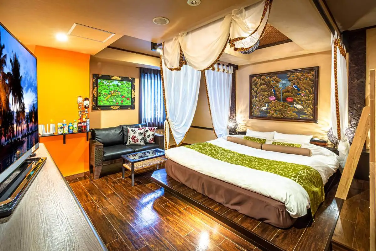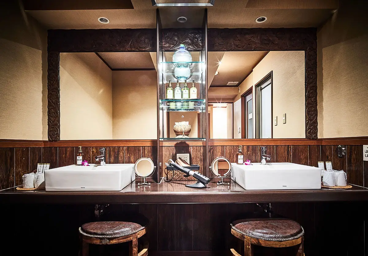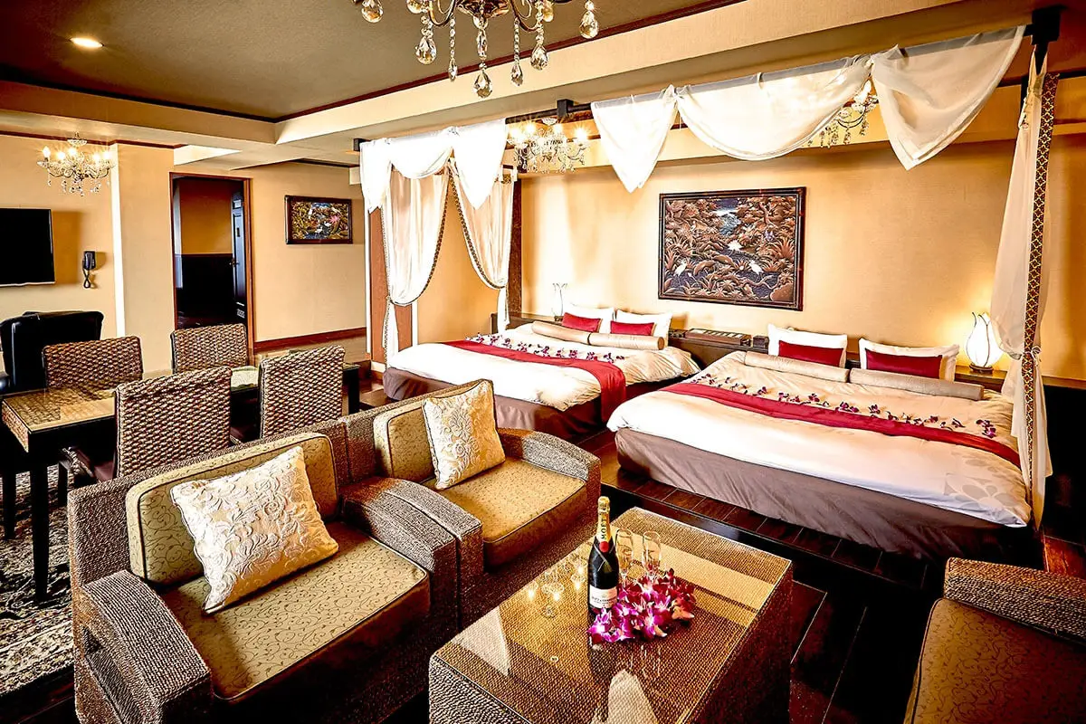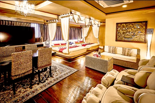 全55室中、限定3室のロイヤルバリアンルームは、プラチナバリアンに次ぐルームの広さを誇ります。 70㎡のスペースの中には、プラチナバリアン同様、まるでバリの高級リゾートを思わせるかの様なリビングルーム、専用岩盤浴、浴室TV付き大型バブルバス、65と55インチの大型TV2台など、いたれりつくせりの快適空間をご用意しております。 またダブルベッドが2つございますので、パーティーやグループでのご利用にも最適な設備を整えております。 この他にもロイヤルバリアンタイプのお部屋はプリティ・バリアンのお部屋の装備にプラスして2ボウルの広い洗面所やマッサージチェア(2台)なども完備しており、リラックスタイムを満喫できます。 都会の喧騒を離れ、日頃頑張る自分にご褒美を・・・。 ロイヤルの名に恥じないハイクオリティーな空間をご満喫下さいませ。