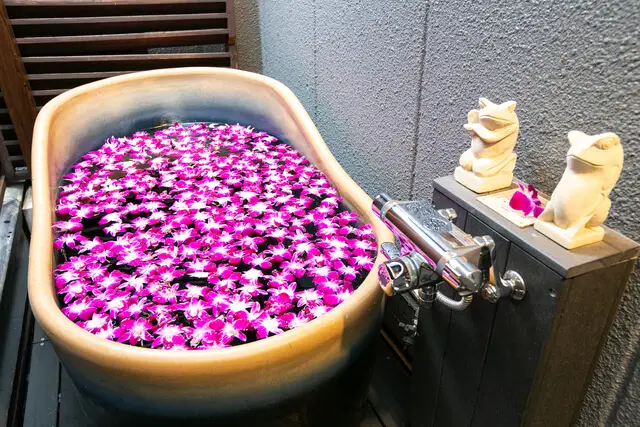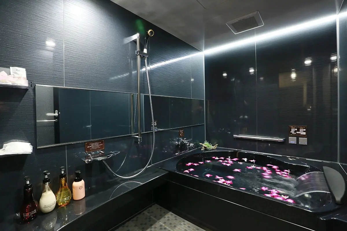 二人で入るのにちょうど良い大きさのお風呂にゆっくり浸かって都会の喧騒に耳を傾ければ、非日常の感覚に包まれます。