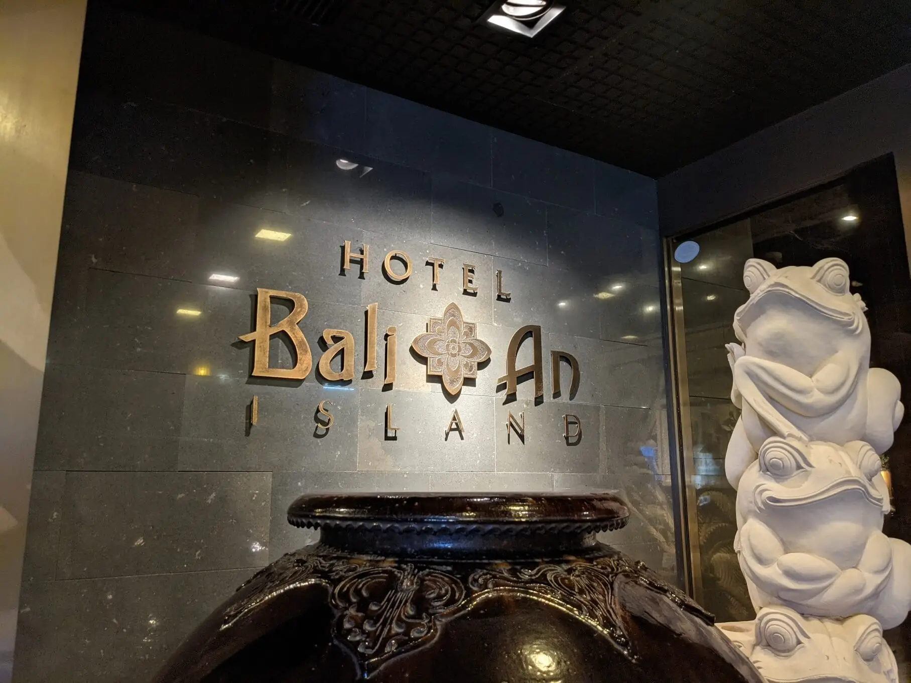 バリ島から運んで来たカエル像が待つメインエントランス