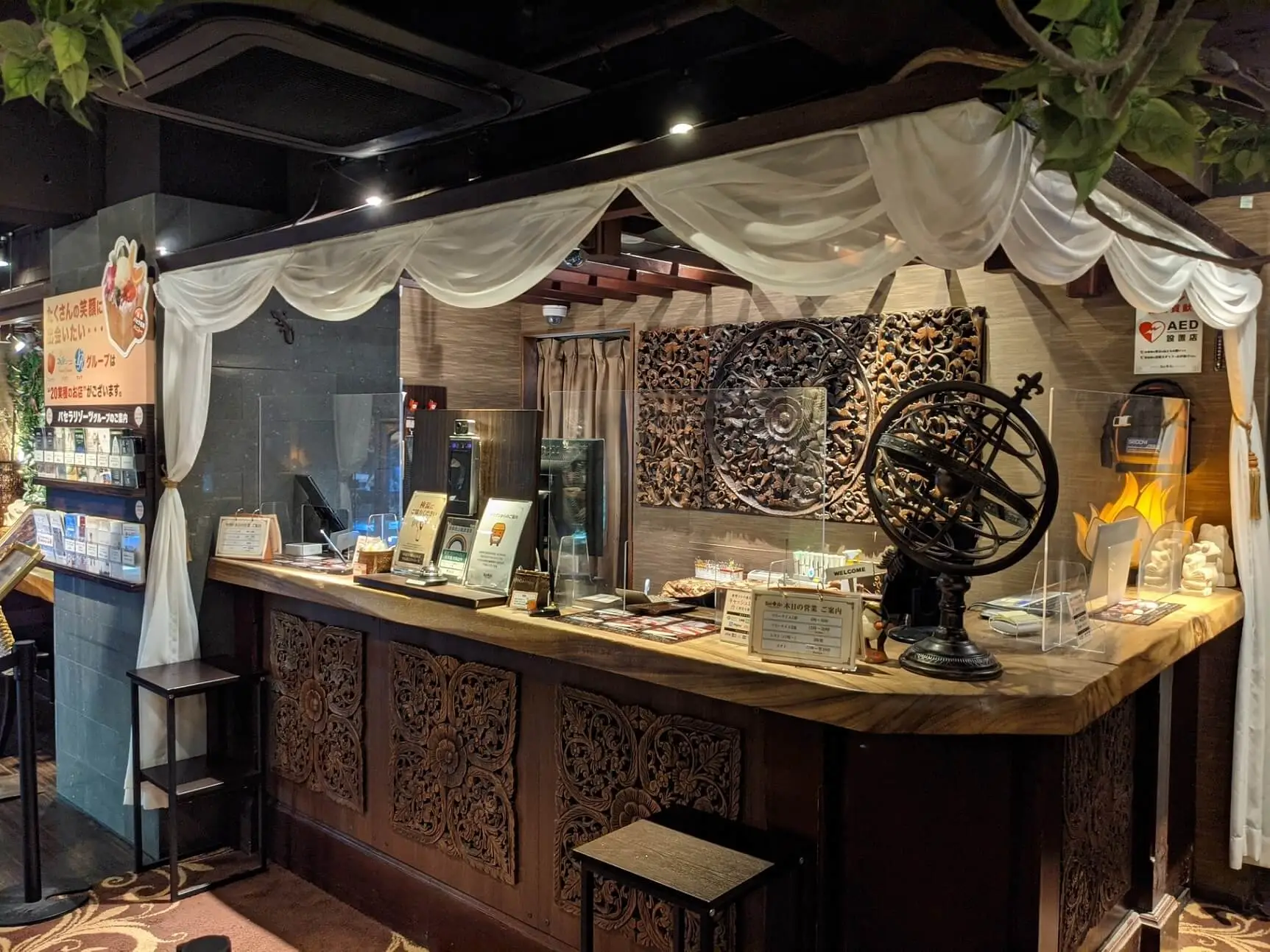大きな天然の一枚板を加工して作られたフロントカウンター。その日のご気分に合わせてお好みのお部屋をお選び下さい。また、お誕生日のお客様はこちらでお伝え頂きますと、バリアンからささやかなサプライズプレゼントをご用意させて頂きます。