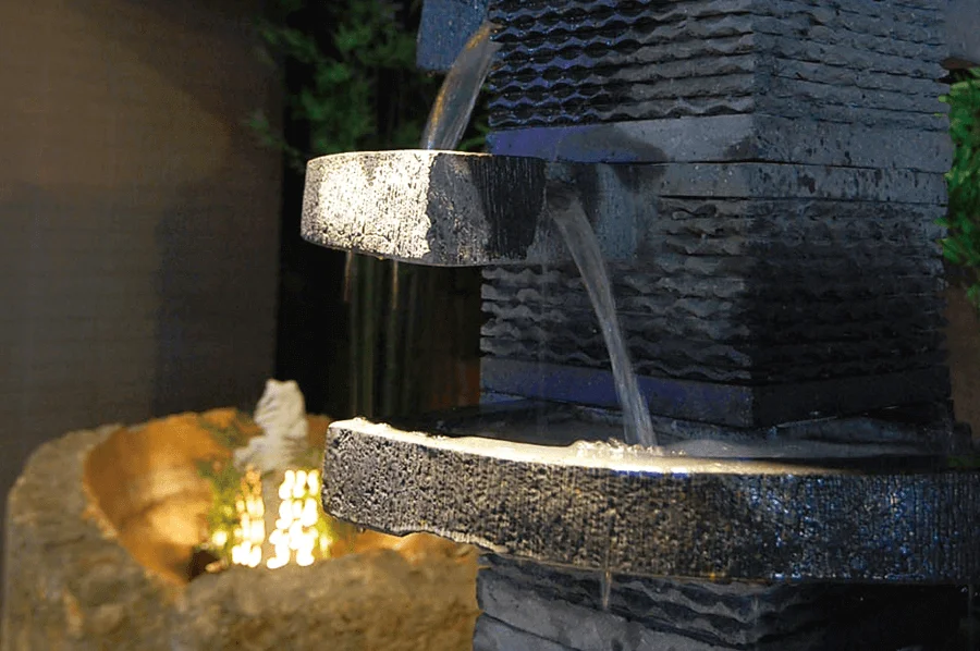 メインエントランス横にある水とバリ石のモニュメント。