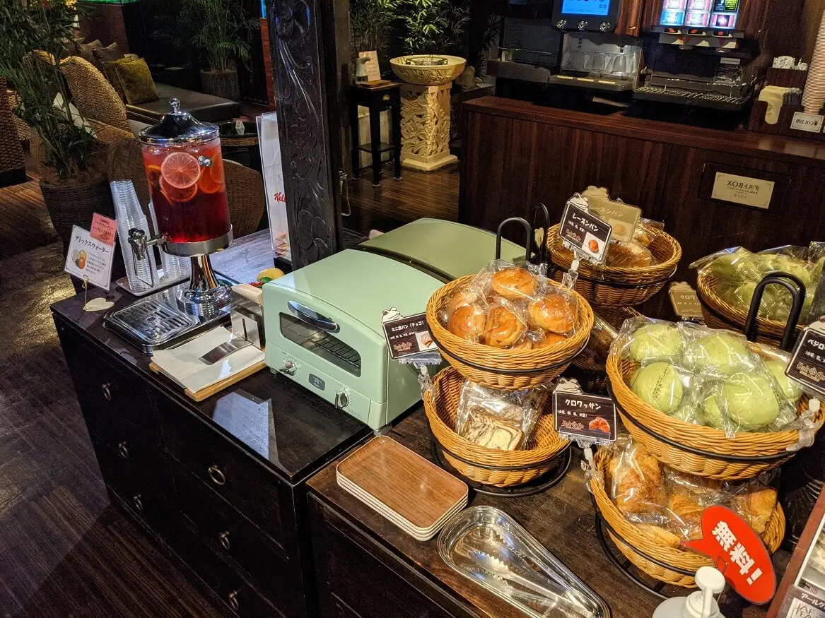 朝10:00~14:00で無料パン&シリアルコーナー オーブンもございますので焼き立てのパンをお楽しみ頂けます。 14:00からはご飯&お茶漬けコーナー・日替わりスープバーがスタート。 オリジナルの組み合わせでお楽しみください。