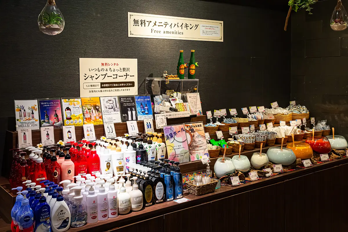 お部屋にあるのものとは別にヘアケア用品、入浴剤や季節に合わせた限定品など20種類以上常設しております。(全て無料!!)