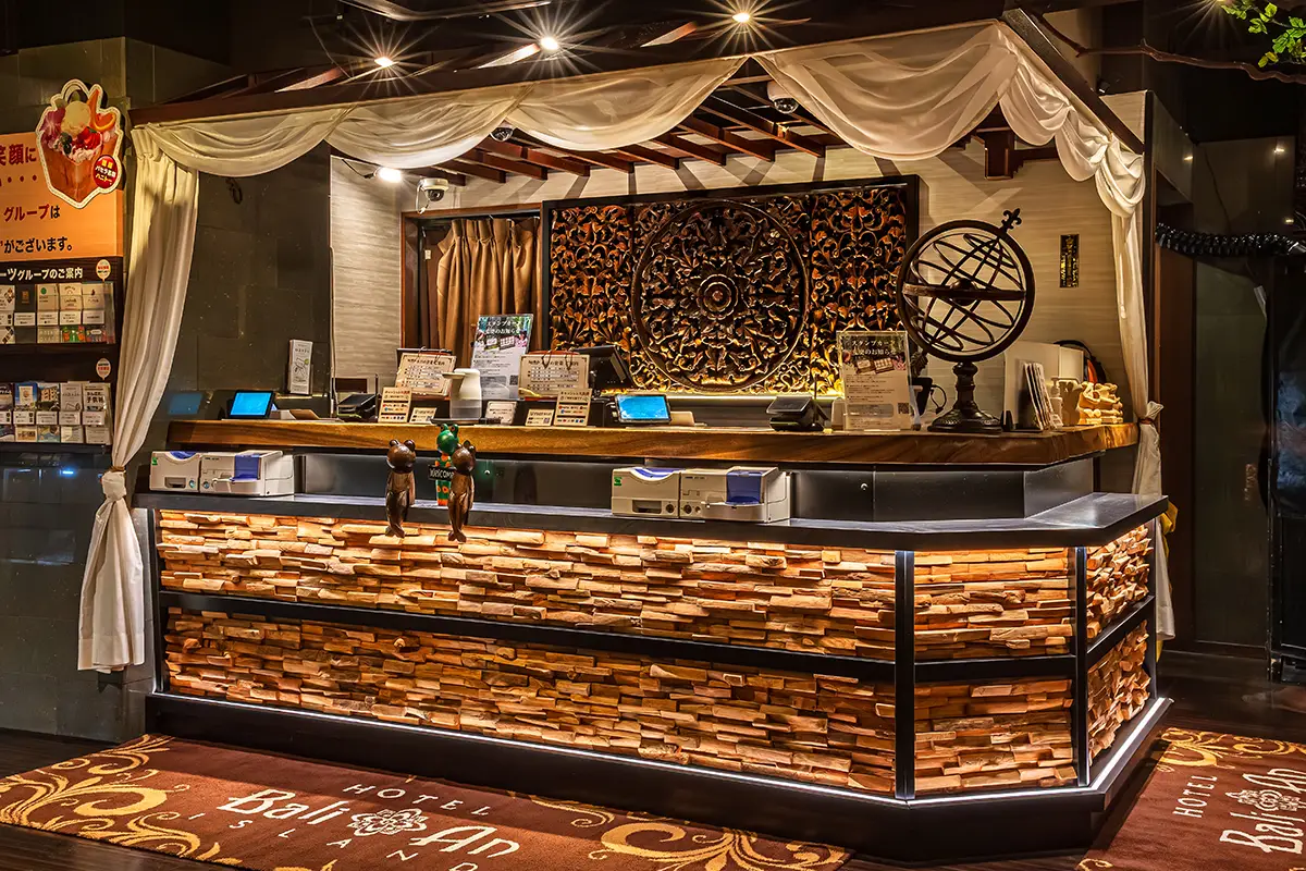 まるでバリのリゾートホテルのようなフロントカウンター。その日のご気分に合わせてお好みのお部屋をお選び下さい。また、お誕生日のお客様はこちらでお伝え頂きますと、バリアンからささやかなサプライズプレゼントをご用意させて頂きます。