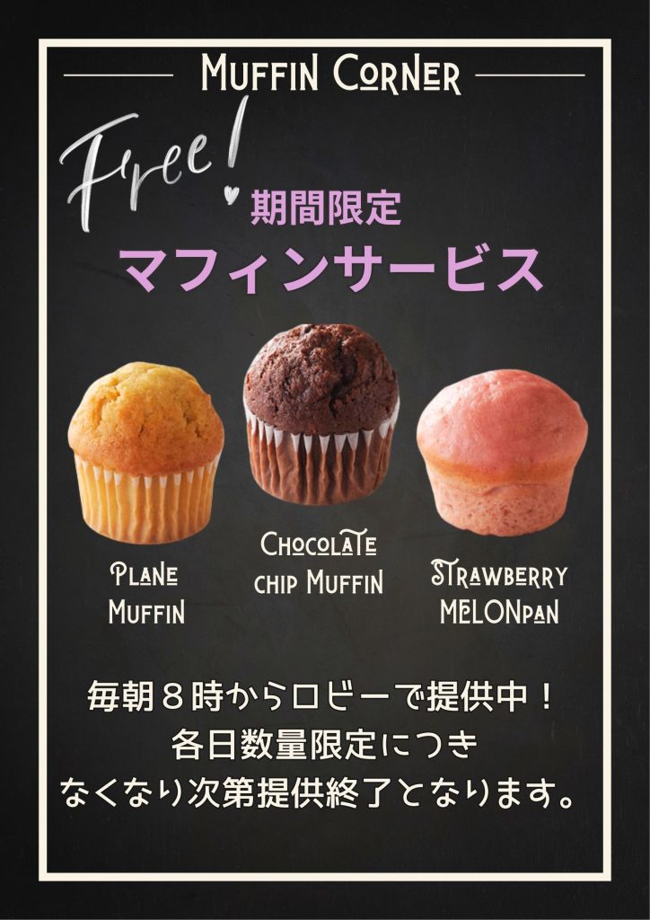期間限定で毎朝8時からロビーにて3種類のマフィンを提供しております。