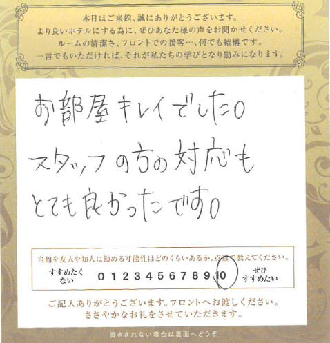 部屋がきれいで快適に過ごせました。 フロントでの接客も丁寧で優しくして 頂きありがとうございました。 また、機会がありましたら利用させて 頂きます。