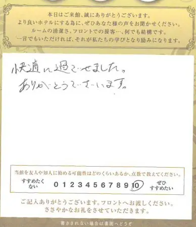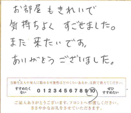 部屋がきれいで快適に過ごせました。 フロントでの接客も丁寧で優しくして 頂きありがとうございました。 また、機会がありましたら利用させて 頂きます。