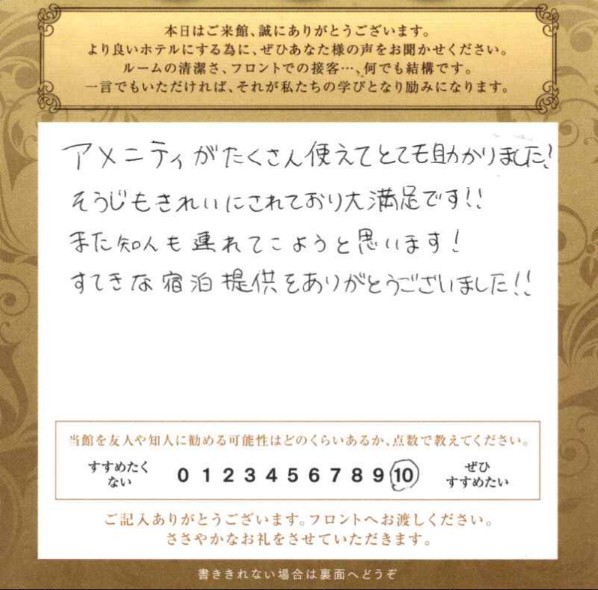 アメニティがたくさん使えてとても助かりました! そうじもきれいにされており大満足です!! また知人も連れてこようと思います! すてきな宿泊提供をありがとうございました!!