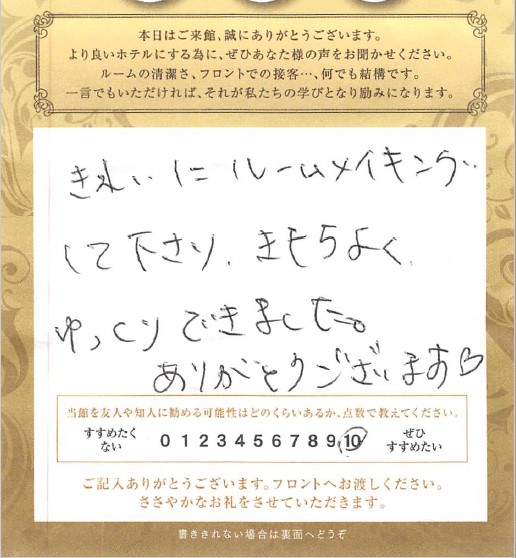 綺麗にルームメイキングして下さり、きもちよく、ゆっくりできました。
