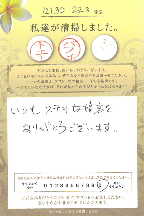 ~お客様のご満足が私達の喜びです~ホテルバリアンリゾートをご利用いただいたお客様から頂いたアンケート・口コミを掲載しております。