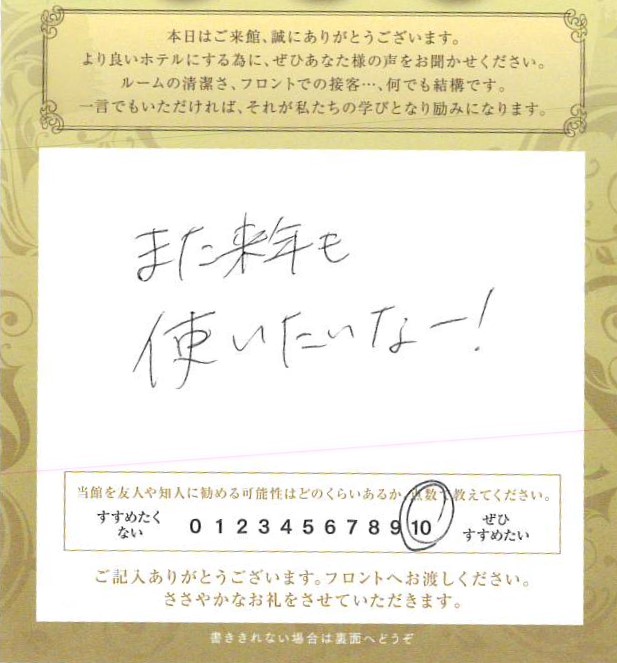 ~お客様のご満足が私達の喜びです~ホテルバリアンリゾートをご利用いただいたお客様から頂いたアンケート・口コミを掲載しております。