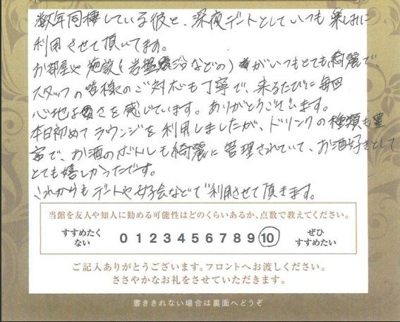 ホテルプティバリガーデン新大久保店からの嬉しいお言葉頂きました
