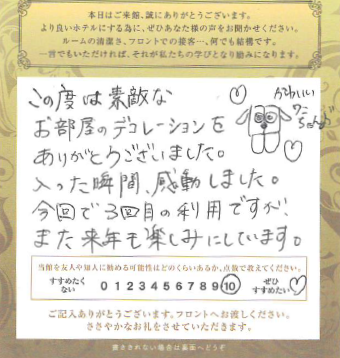 この度は素敵なお部屋のデコレーションをありがとうございました。入った瞬間、感動しました。今回で3回目の利用ですが、また来年も楽しみにしています。