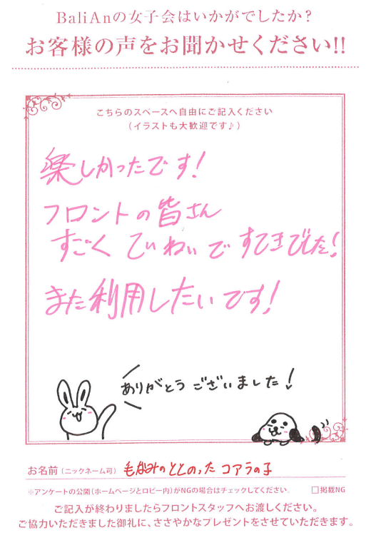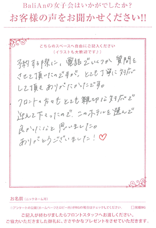 ~お客様のご満足が私達の喜びです~ホテルバリアンリゾートをご利用いただいたお客様から頂いたアンケート・口コミを掲載しております。